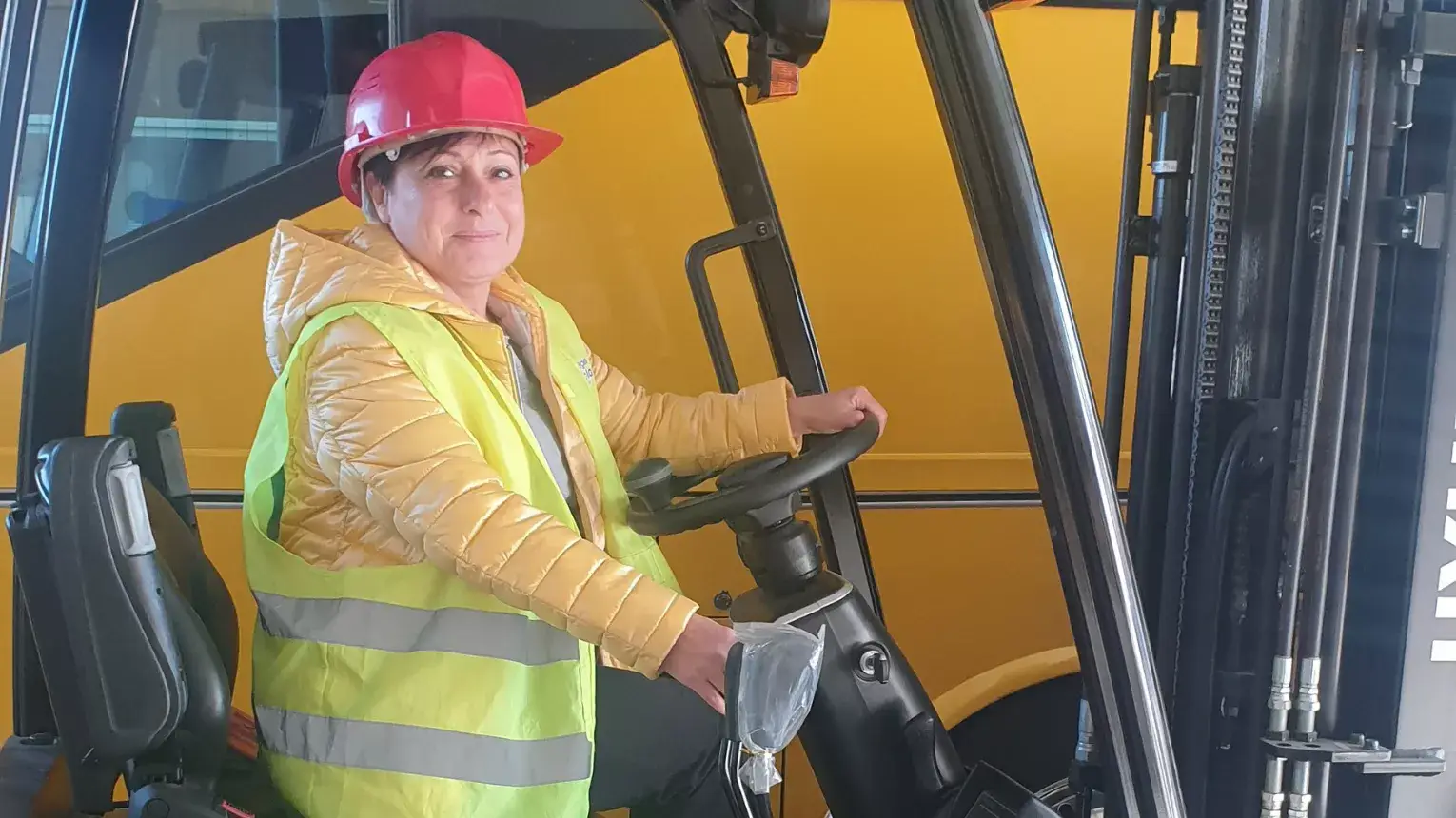 A megajándékozott kipróbálja, hogyan boldogul egy háromkerekű targoncával, melyben az erővisszacsatoló kormány biztosítja a kezelő kényelmét!