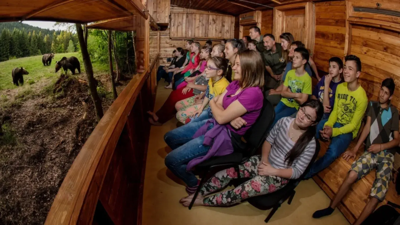 A helyi tiszteletbeli „medvepásztor" vezetésével egy erdei úton terepjáróval - vagy igény szerint szekéren - teszik meg a medveleshez vezető utat. Az utolsó 200 méteren fokozott csendben, libasorban haladva gyalogosan érik el a kis faházat, ahol a következő majd 3 órában a medvéké és egyéb vadállatoké lesz a főszerep.
