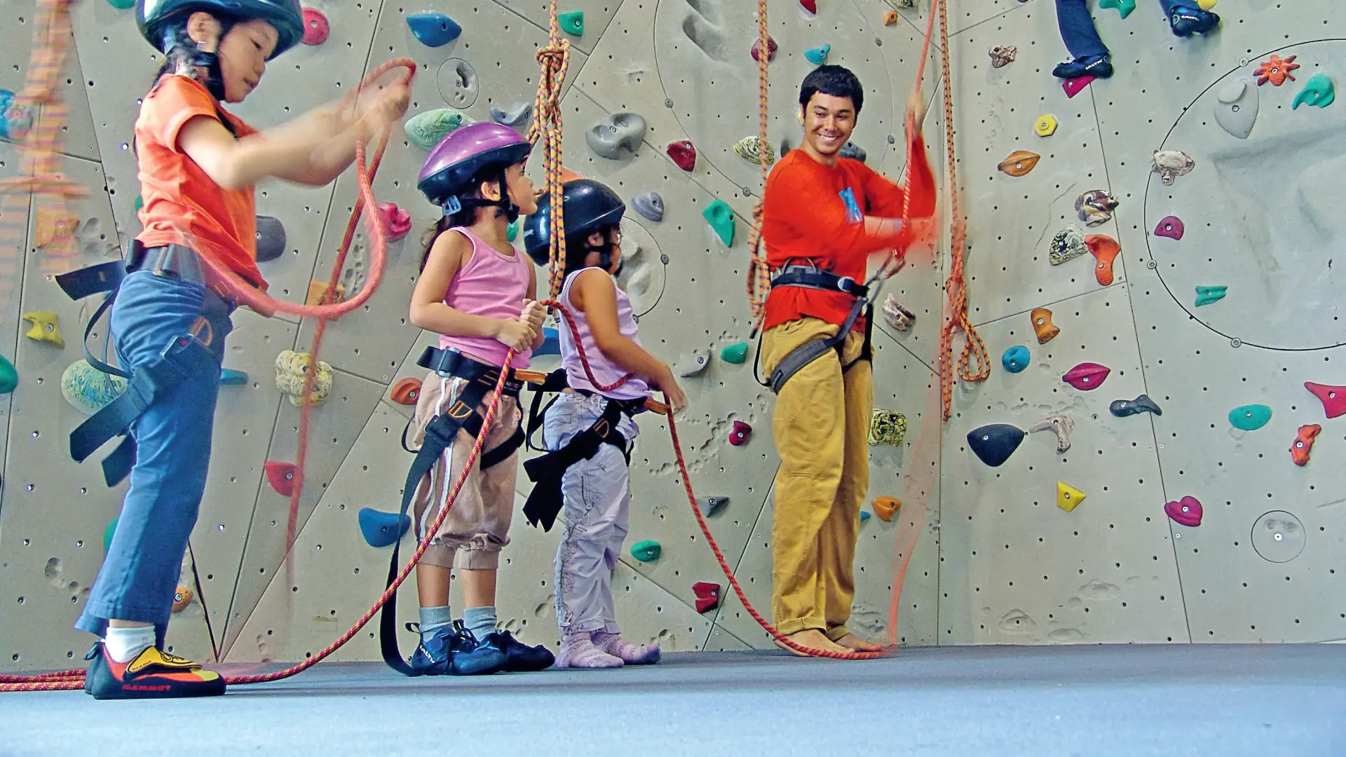 A lényeg, hogy ha a gyerkőc bátor akkor meg se áll a 13 méteres fal tetejéig, ha félénkebb nem gond, a lenti fogásokon gyakorolnak.