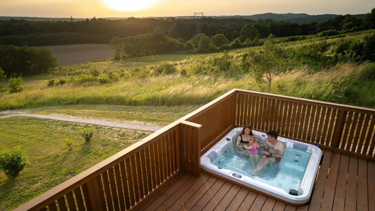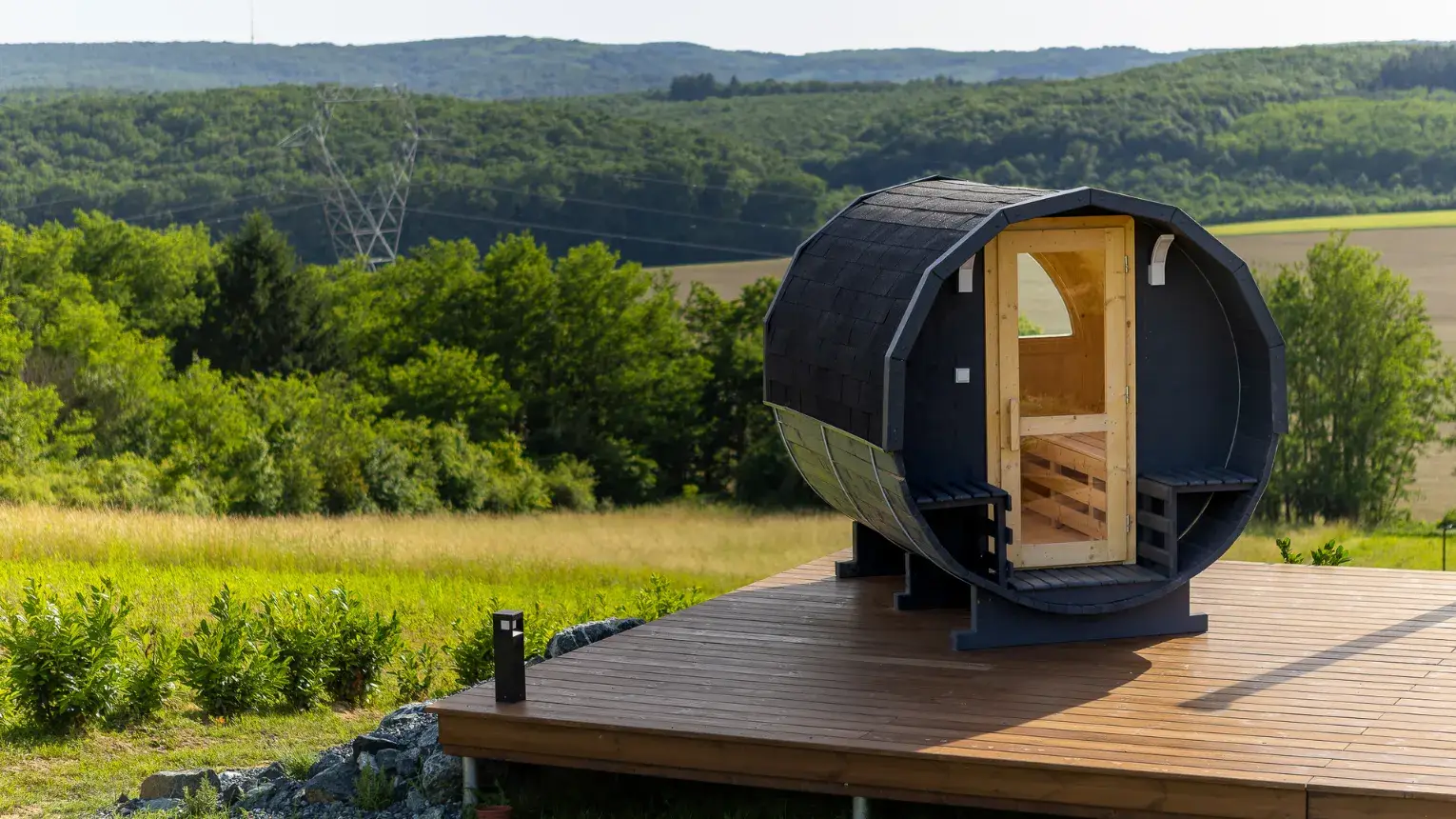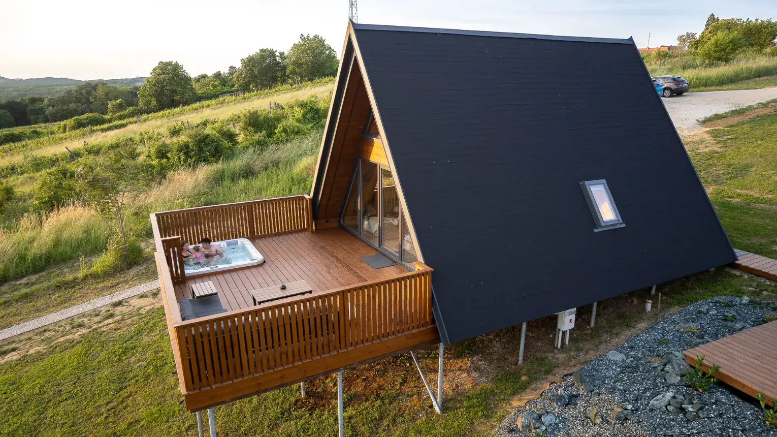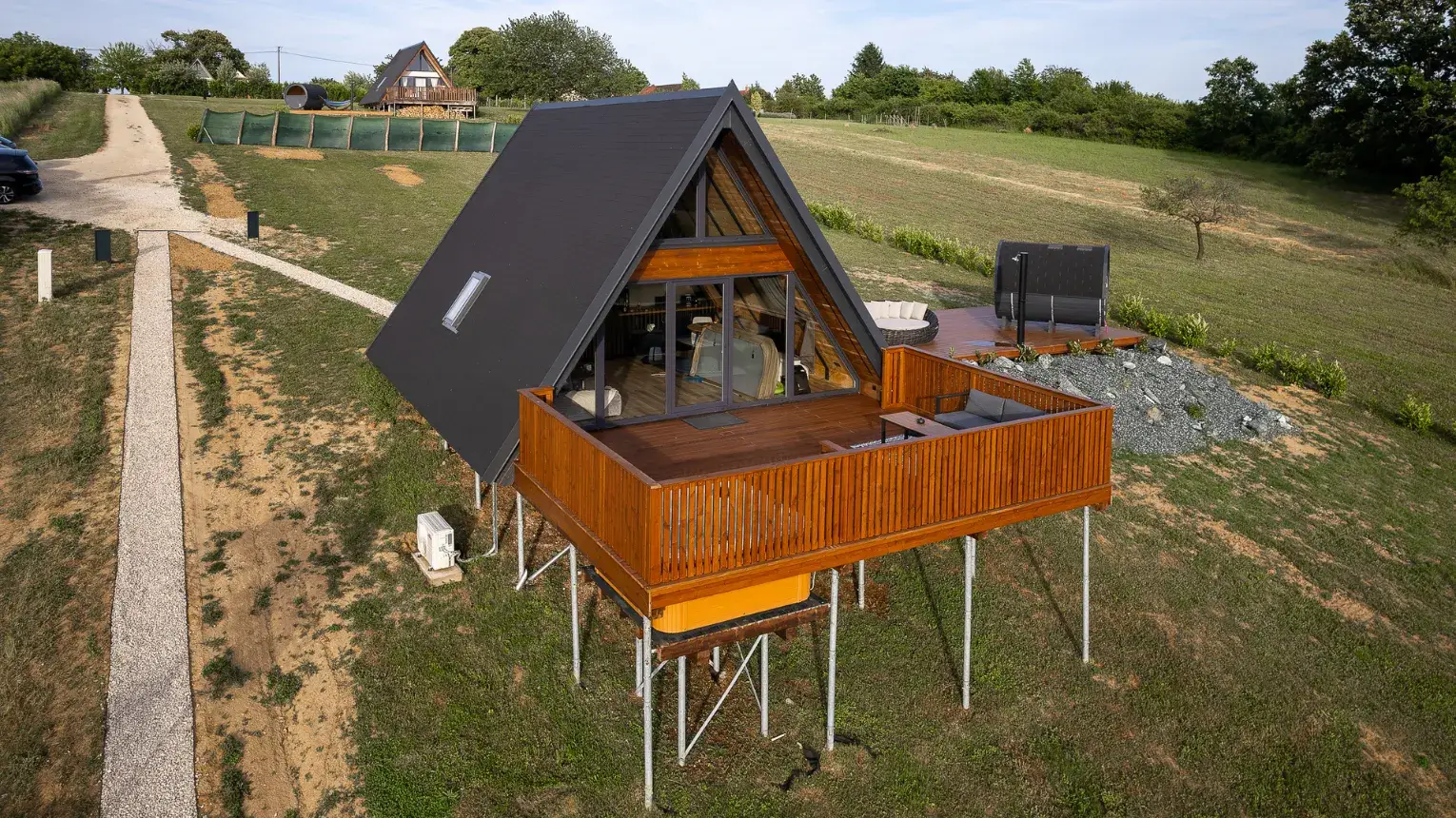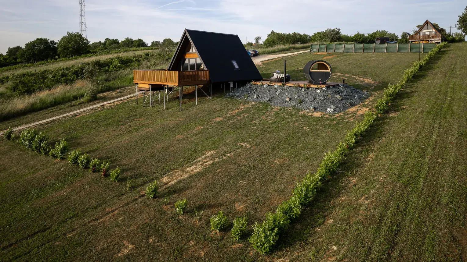 Lebegő luxus a szőlőhegyen - A WoodParadise birtok harmadik gyöngyszeme (2025 júniusban épült), egy különleges menedék, ahol a természet ölelése és az elegancia tökéletes harmóniában találkozik. A domboldalra épült ház lebegő teraszáról a panoráma egyszerűen lélegzetelállító. Mintha a levegőben pihennél! A fekete kiegészítők stílusos kontrasztot adnak a természetes környezethez, miközben prémium designbútorok, besüllyesztett jakuzzi, privát szauna és egy óriási kerti pihenőágy gondoskodnak a teljes kikapcsolódásról.