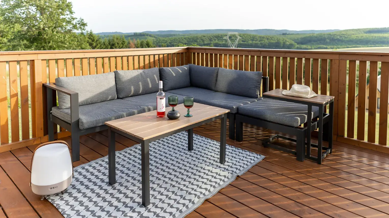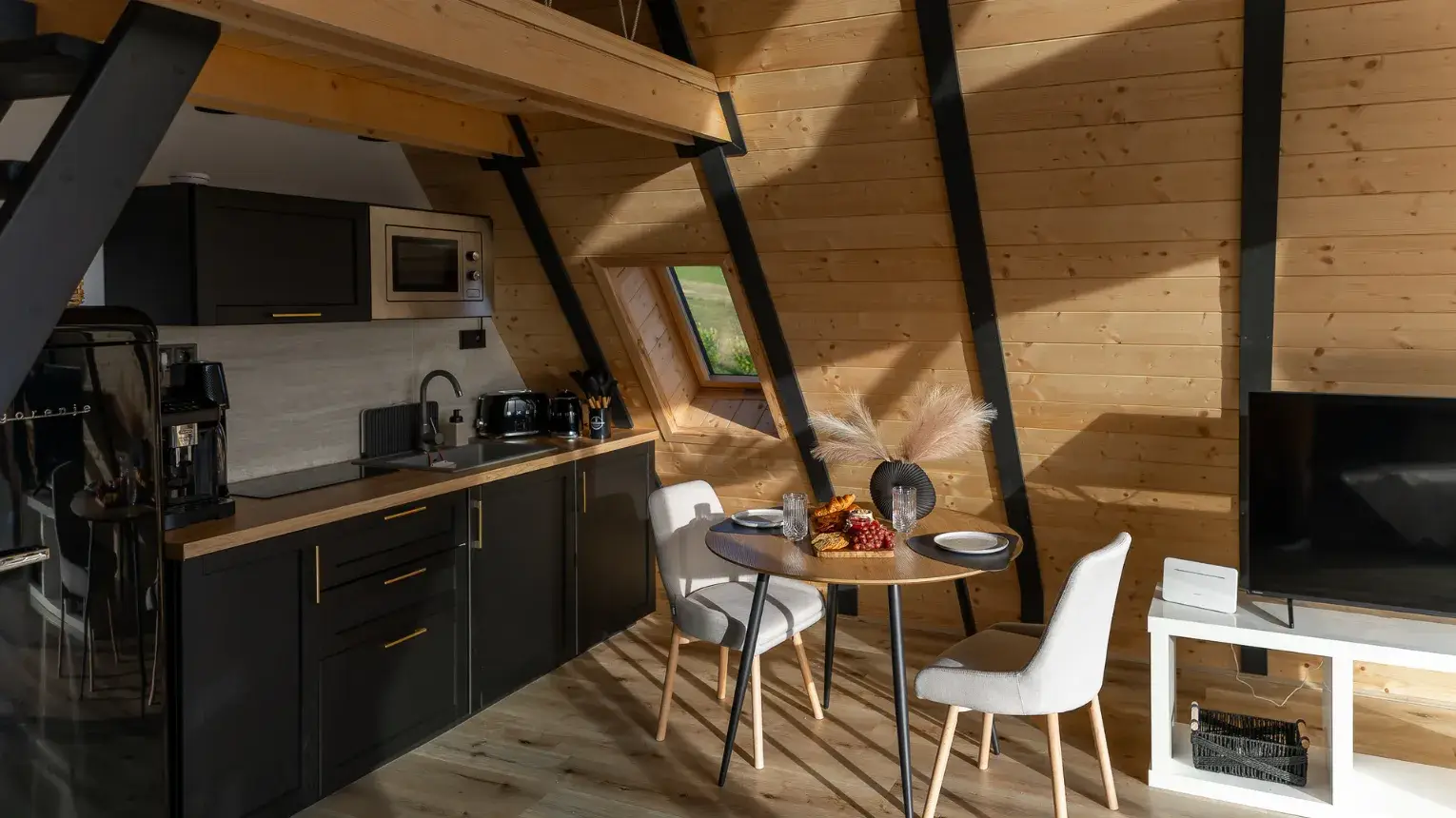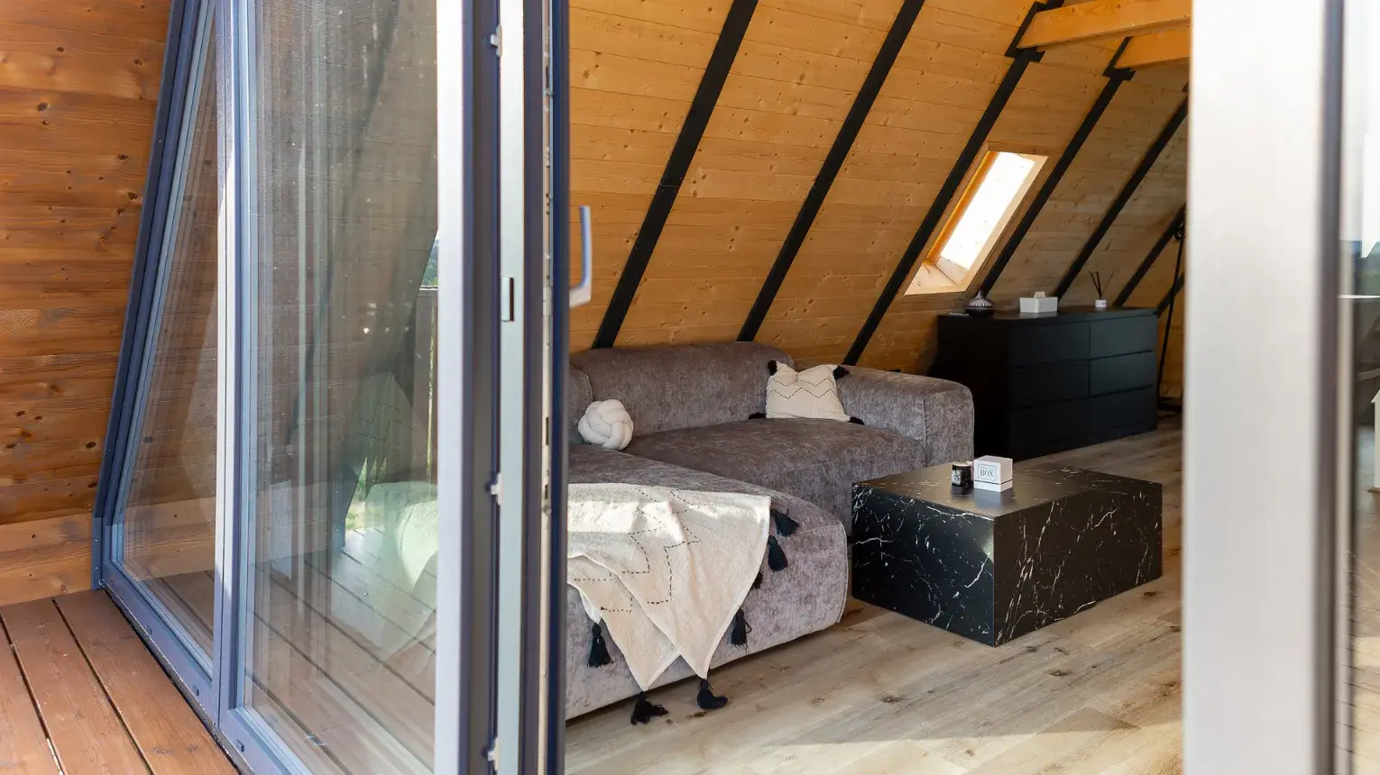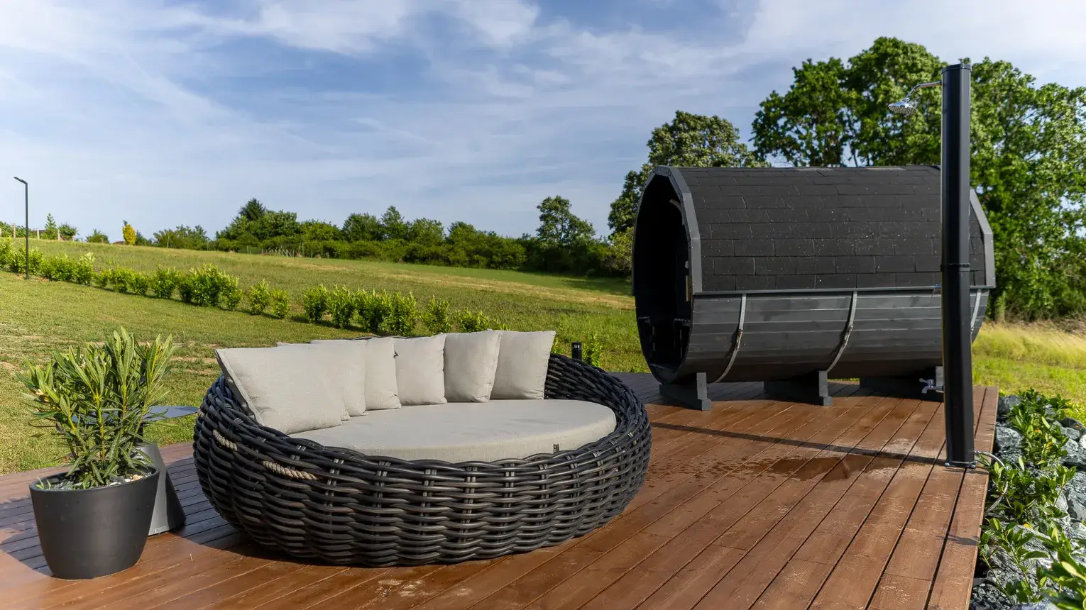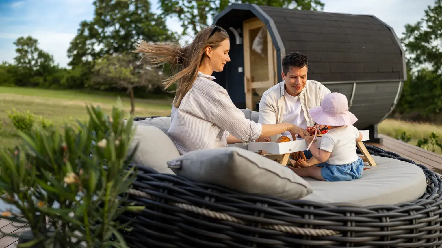 Lebegő luxus a szőlőhegyen - A WoodParadise birtok harmadik gyöngyszeme (2025 júniusban épült), egy különleges menedék, ahol a természet ölelése és az elegancia tökéletes harmóniában találkozik. A domboldalra épült ház lebegő teraszáról a panoráma egyszerűen lélegzetelállító. Mintha a levegőben pihennél! A fekete kiegészítők stílusos kontrasztot adnak a természetes környezethez, miközben prémium designbútorok, besüllyesztett jakuzzi, privát szauna és egy óriási kerti pihenőágy gondoskodnak a teljes kikapcsolódásról.