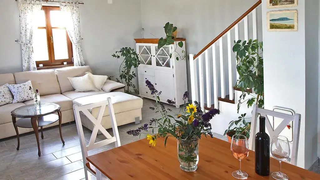 A ház alsó szintjén Balatonra néz. Az örök-panorámás terasz a Tanúhegyre. A házban nappali és konyha-étkező található, a nappaliban kihúzható kanapéággyal. Az emeleten két különálló, franciaággyal felszerelt szoba található.