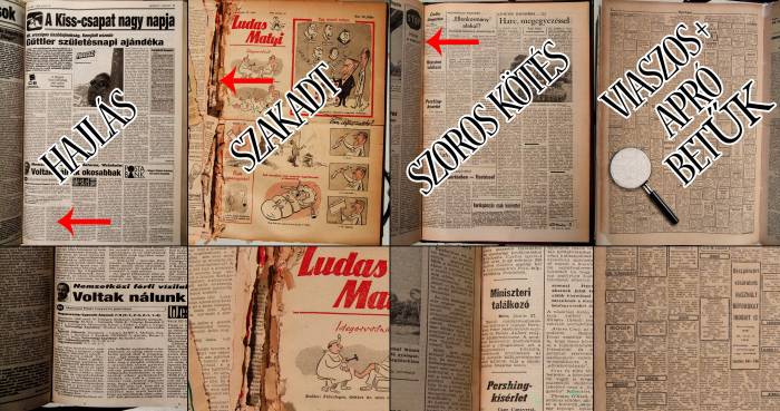 Viszont vannak olyan hibák, sérülések, fűzési sajátosságok amiken nem tudunk javítani. Egy 50-60-70 éves újság egy igen más korban készült, más technikával, nyomdai munkálatokkal.