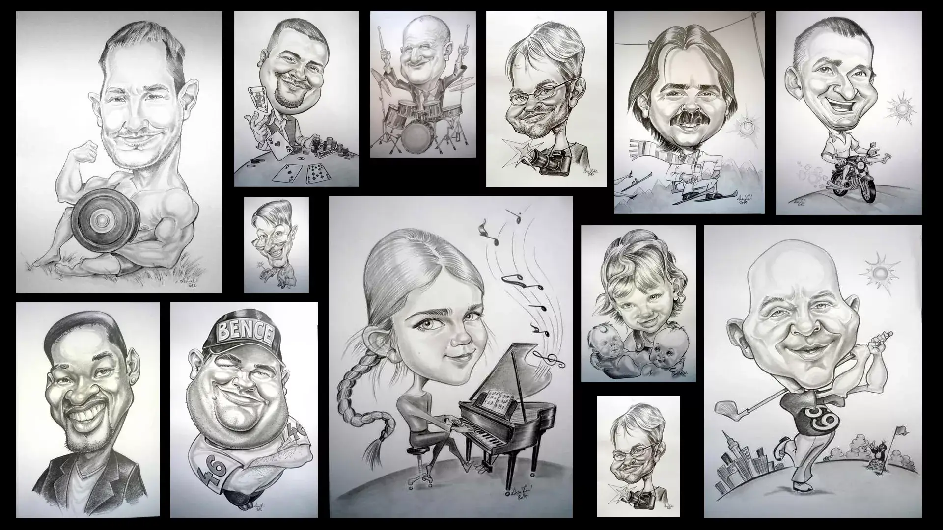 A karikatúrista művészet szabad teret enged a különböző kéréseknek. Az ünnepeltet különféle környezetbe, szituációba tudja helyezni a karikatúrista.